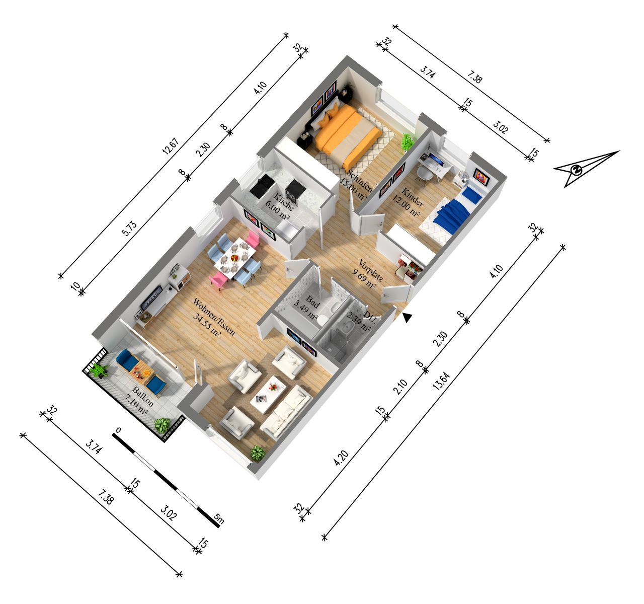Unser einzigartiges 3D-Grundrissdesign, das Ihrem Raum Tiefe, Klarheit und visuelle Attraktivität verleiht.