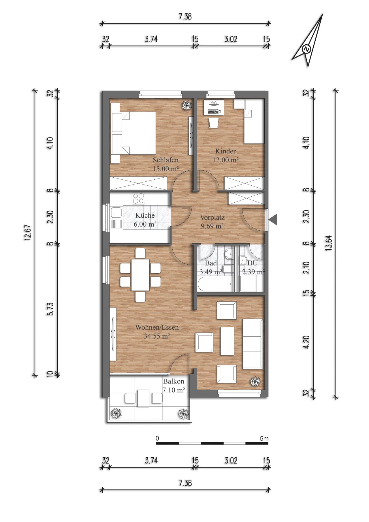 Unser einzigartiges farbiges Grundrissdesign verleiht Ihrem Raum durch sorgfältig ausgewählte, harmonische Farbtöne Leben und Charakter. Dieser visuell ansprechende Ansatz erhöht die räumliche Klarheit, hebt Funktionsbereiche hervor und schafft eine ansprechende Präsentation, die das Layout sowohl leicht verständlich als auch ästhetisch unverwechselbar macht.